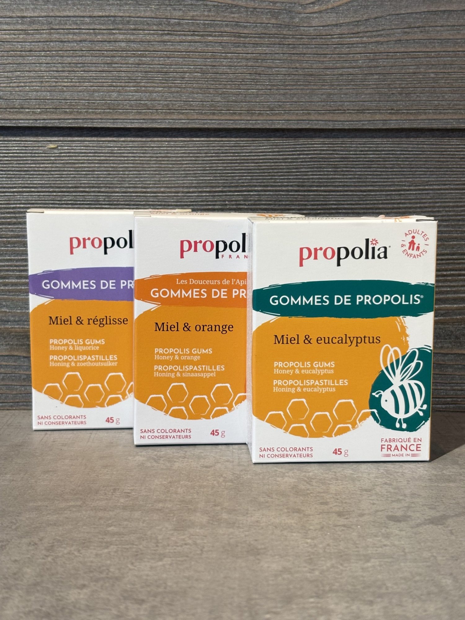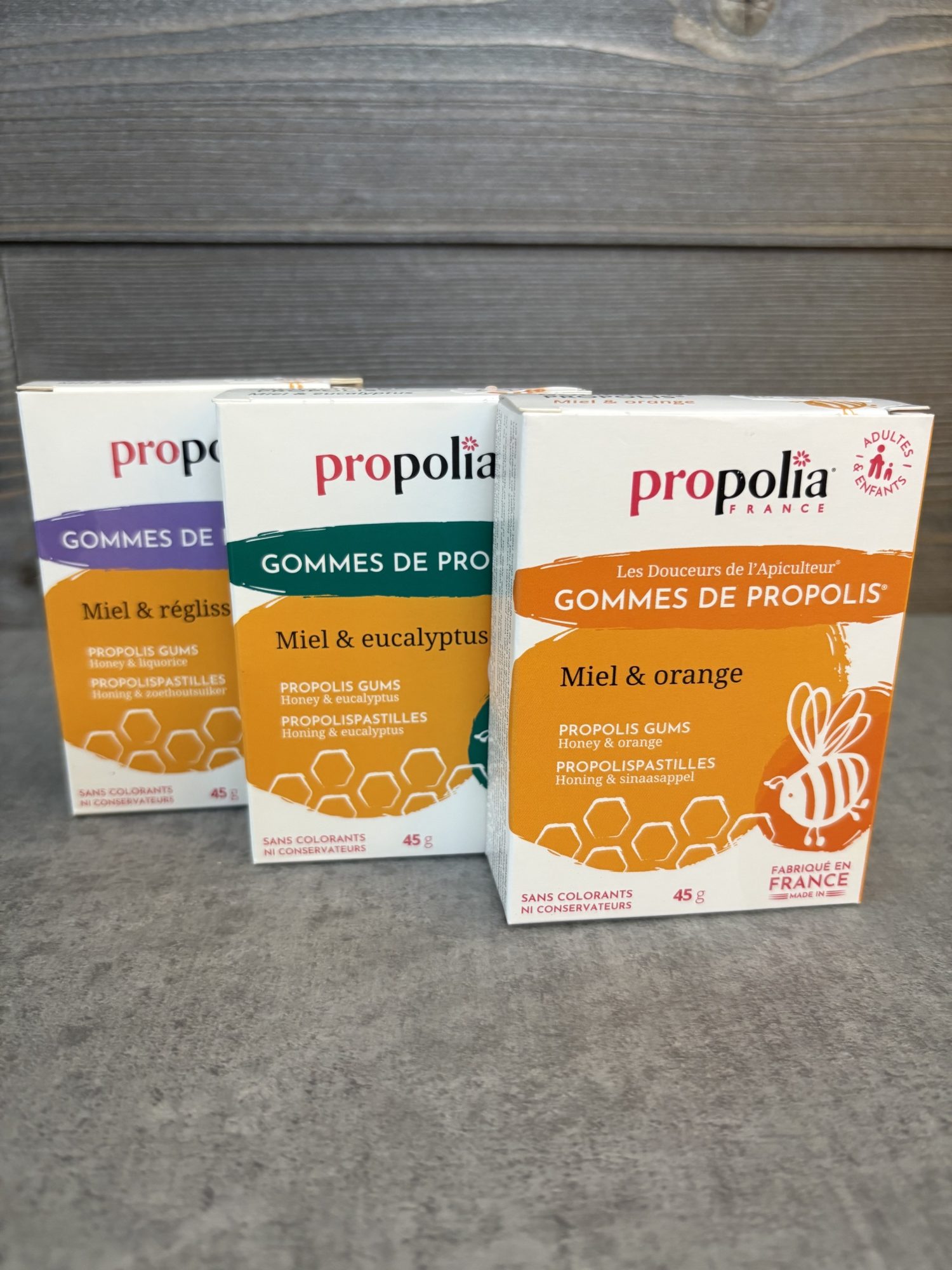 Il en existe en 3 parfums eucalyptus, orange et réglisse apaise les mots de gorges tout comme le sirop propolia https://miel-fourneaux.fr/produit/sirop-pour-la-gorge-propolia/